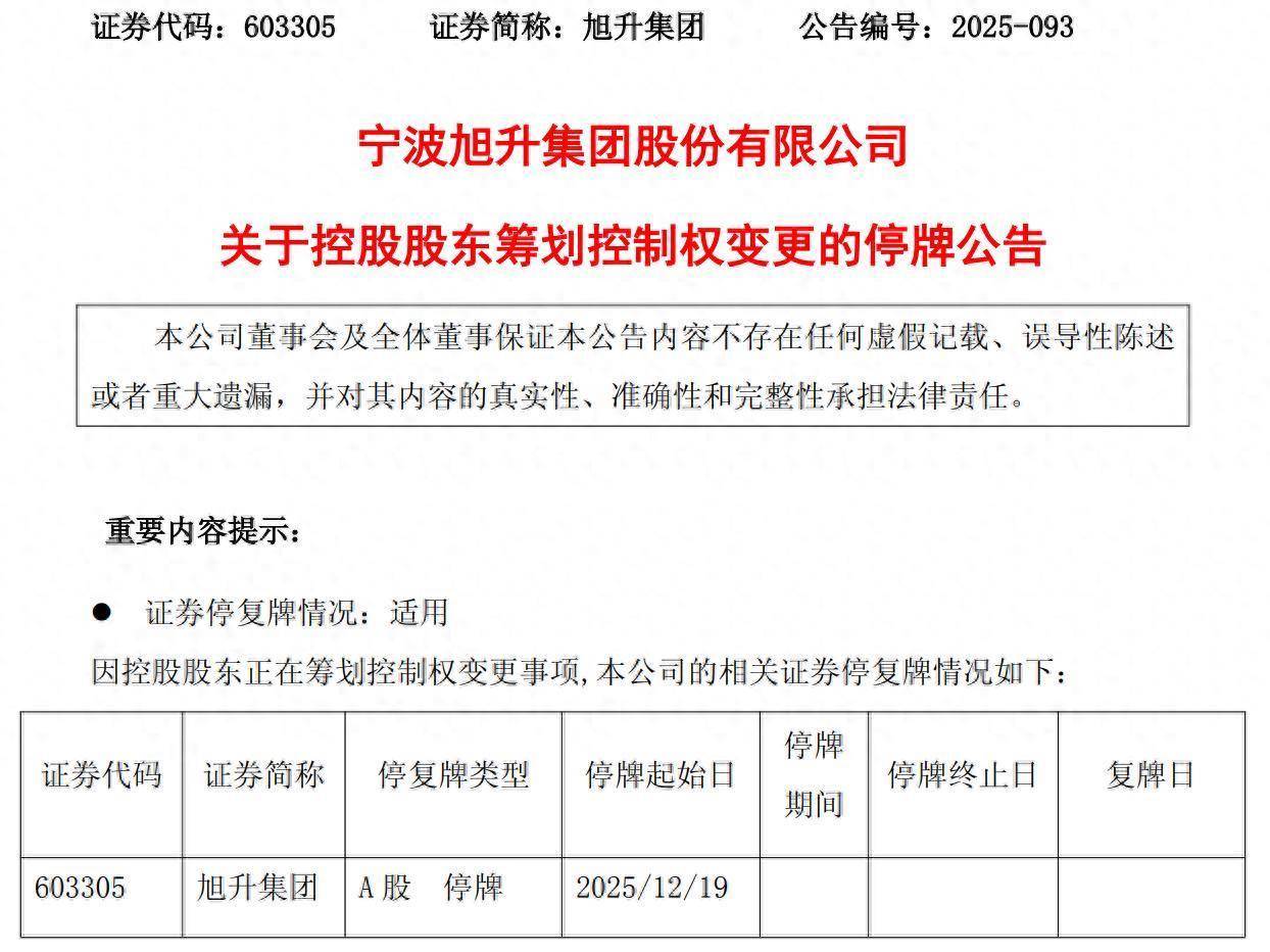 12月18日晚间,旭升集团(603305)发布公告,公司于2025年12月18日接到控股股东、实际控制人徐旭东通知,徐旭东及其一致行动人宁波梅山保税港区旭晟控股有限公司、香港旭日实业有限公司正在筹划涉及所持有公司股份转让事宜,该事项可能导致公司的控制权变更。公司股票自2025年12月19日(星期五)开市起停牌,预计停牌时间不超过2个交易日。
