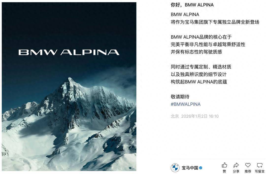 2026年1月1日,宝马集团正式官宣将传奇性能品牌ALPINA阿尔宾娜收编为旗下专属独立品牌“BMW ALPINA”,当日完成商标权移交,这个以“性能与豪华平衡”为核心的品牌将以全新身份再度登陆中国市场,成为新年车圈首个重磅事件。